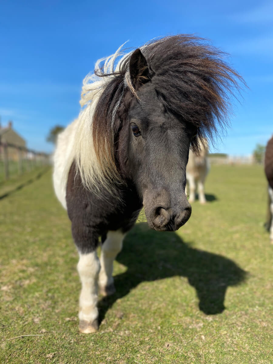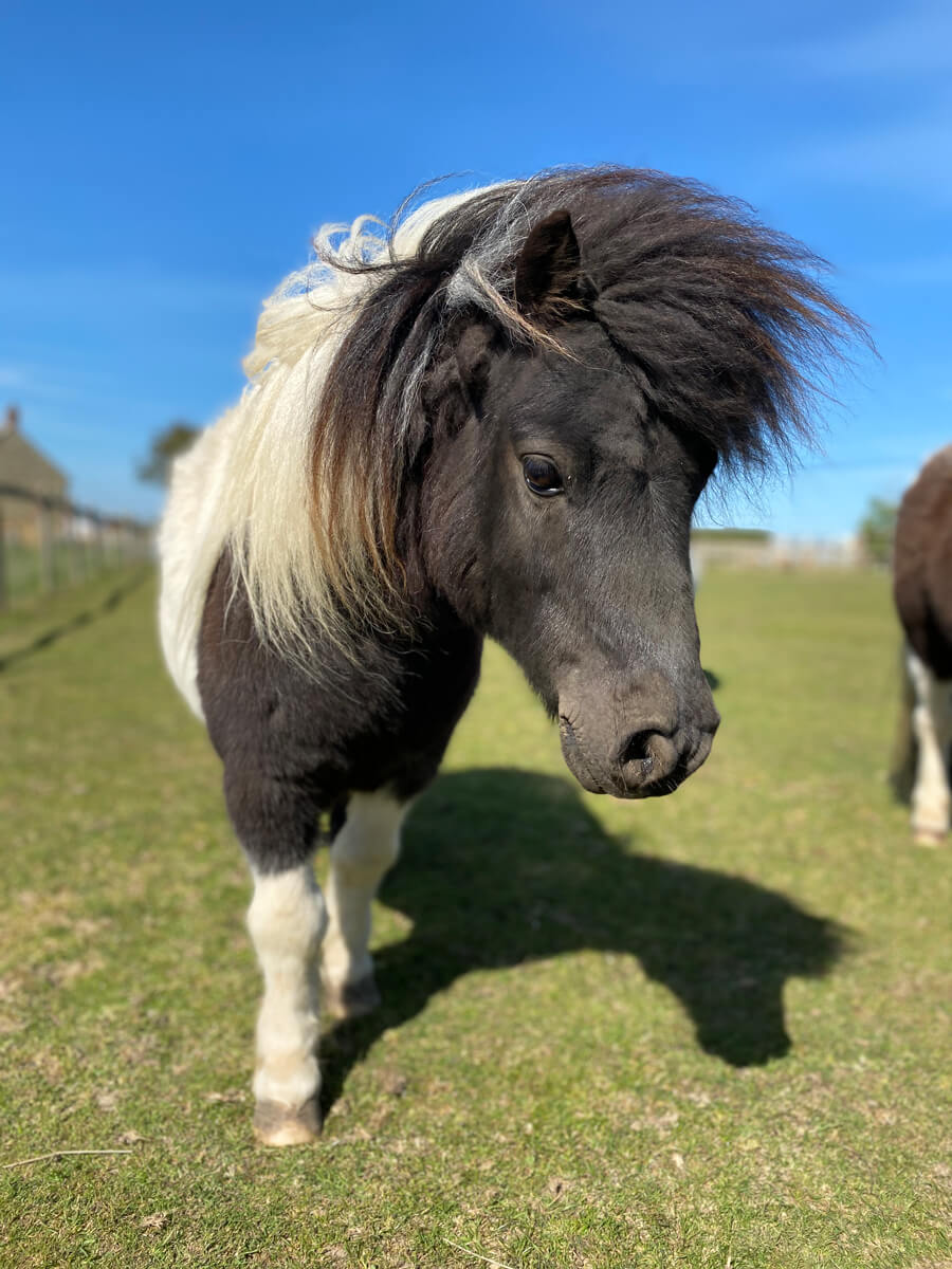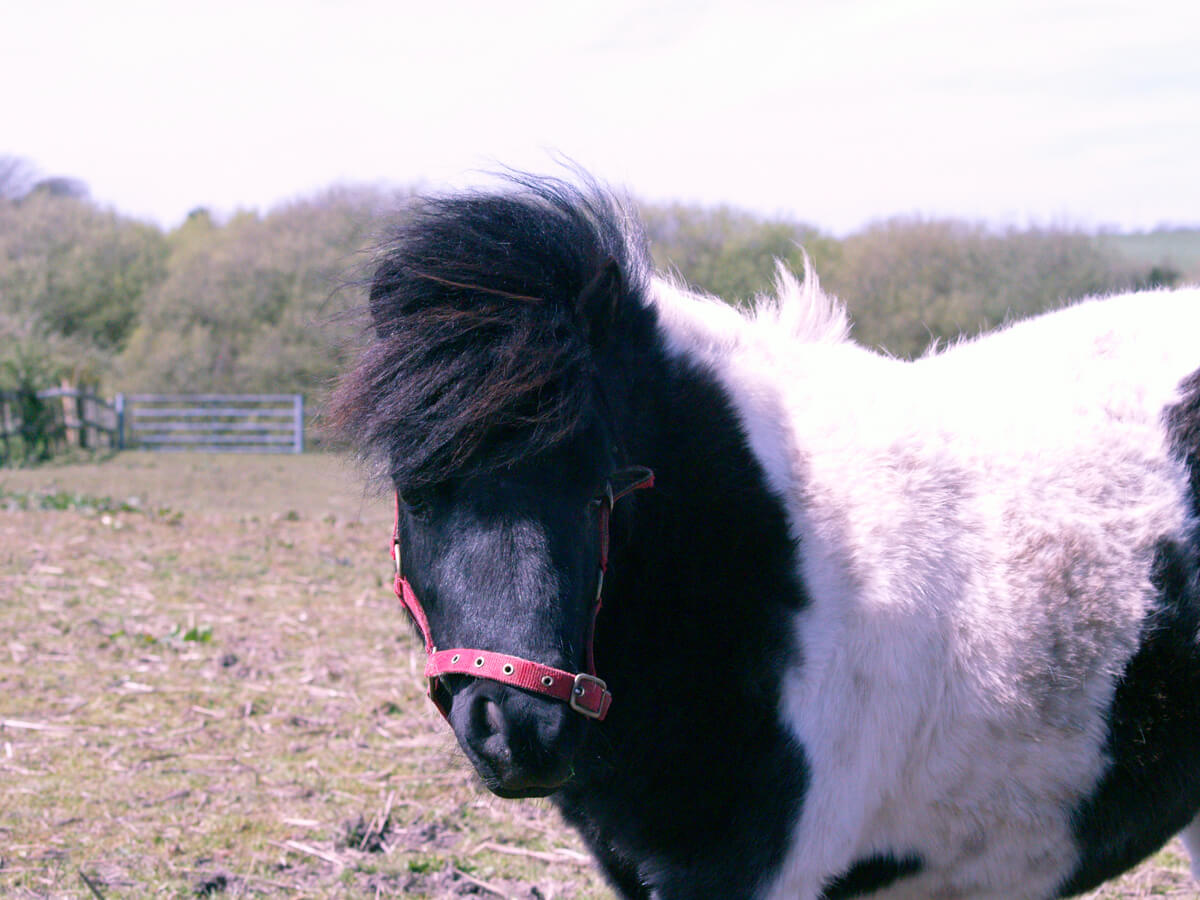 Ant is piebald (black and white) miniature Shetland pony. He loves lying flat out in the paddock in the sun! He was very nervous when he first arrived at the sanctuary but has really grown in confidence.