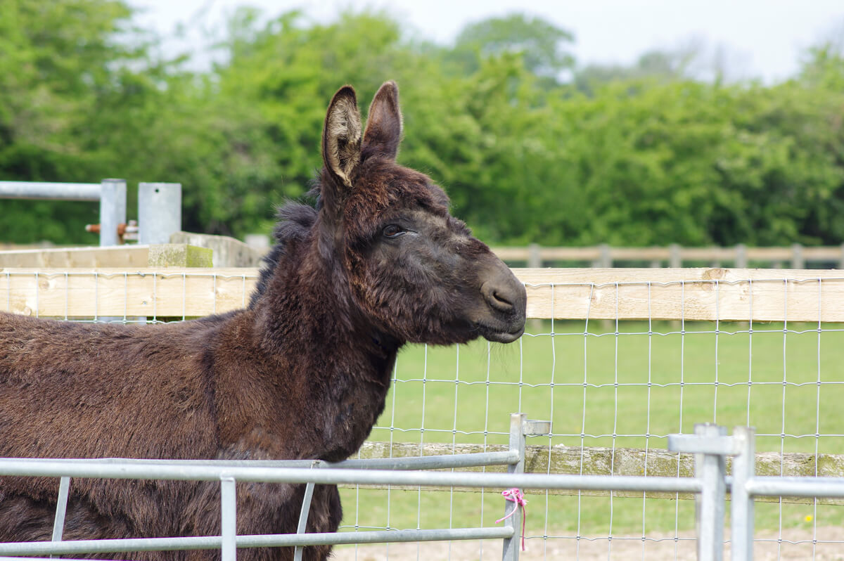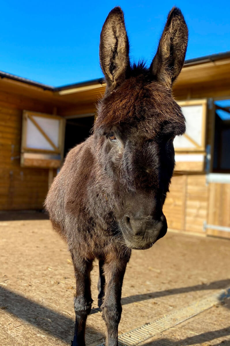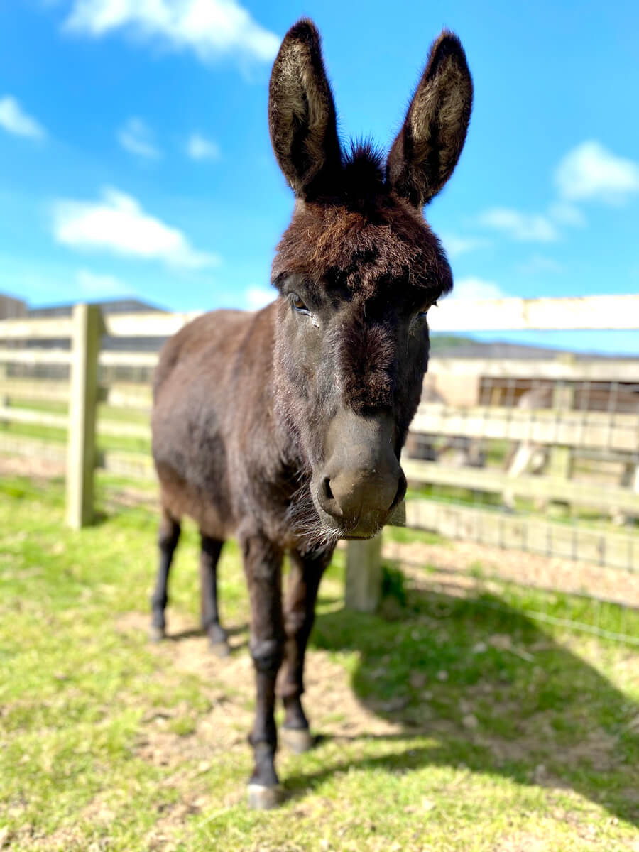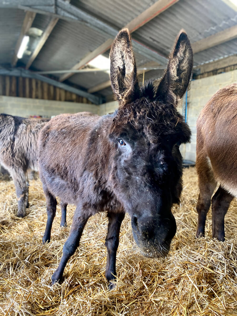 Sadly Barbara was originally found abandoned in a field in Norfolk. She is quiet, sweet natured and easy going. She has many friends amongst the herd. Barbara is a beautiful black donkey like her Dad Blakey.
