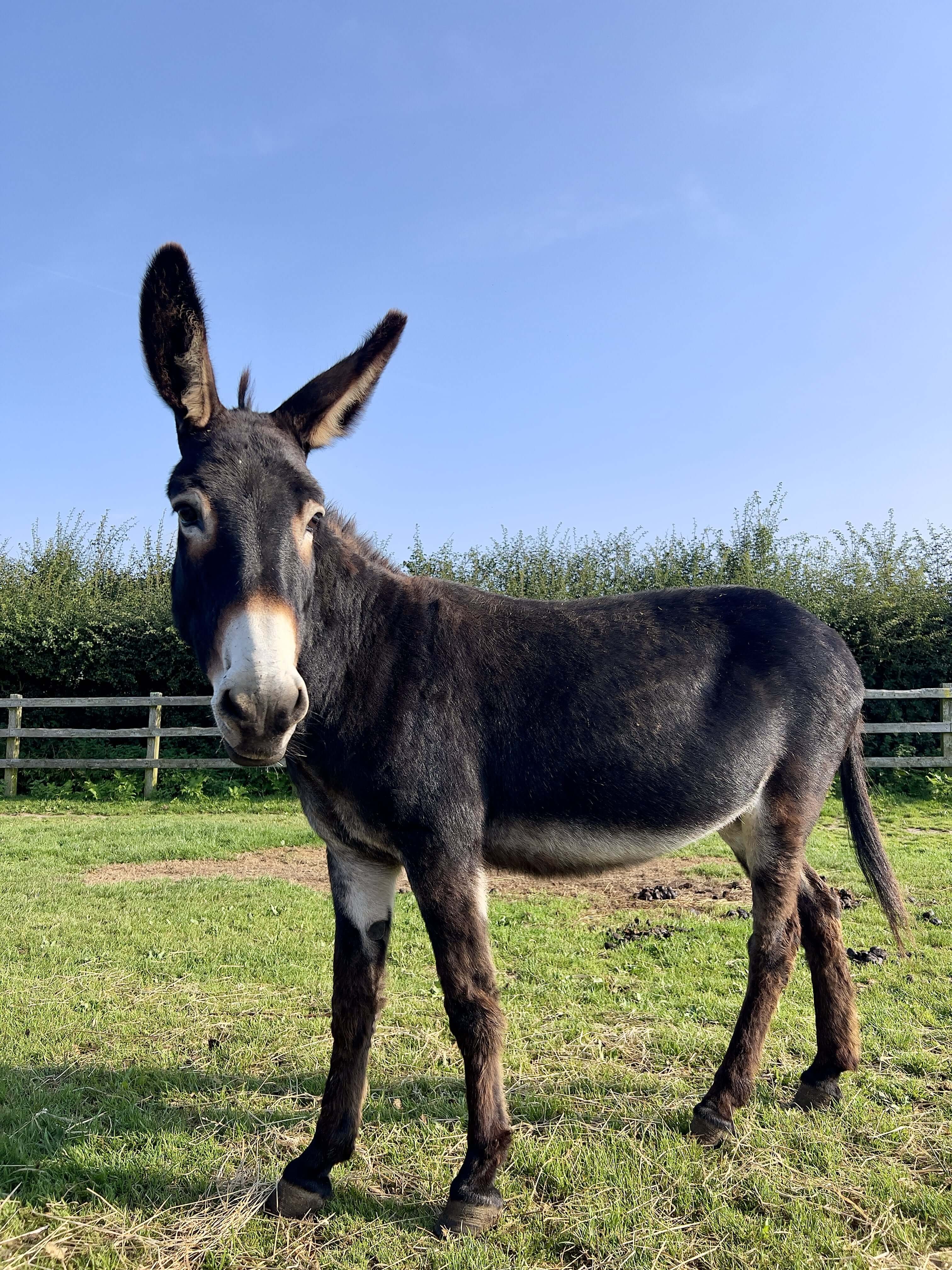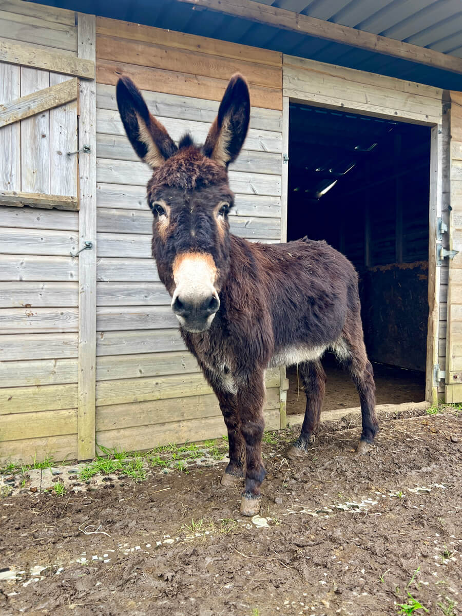 Betty arrived in December 2023 along with 3 others. She is 9 years old and is best suited to the Allsorts herd. She was lacking confidence with being handled so needed a calm herd with other confident donkeys. She is doing well after working with our team.