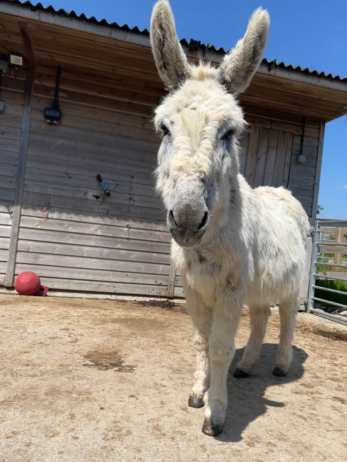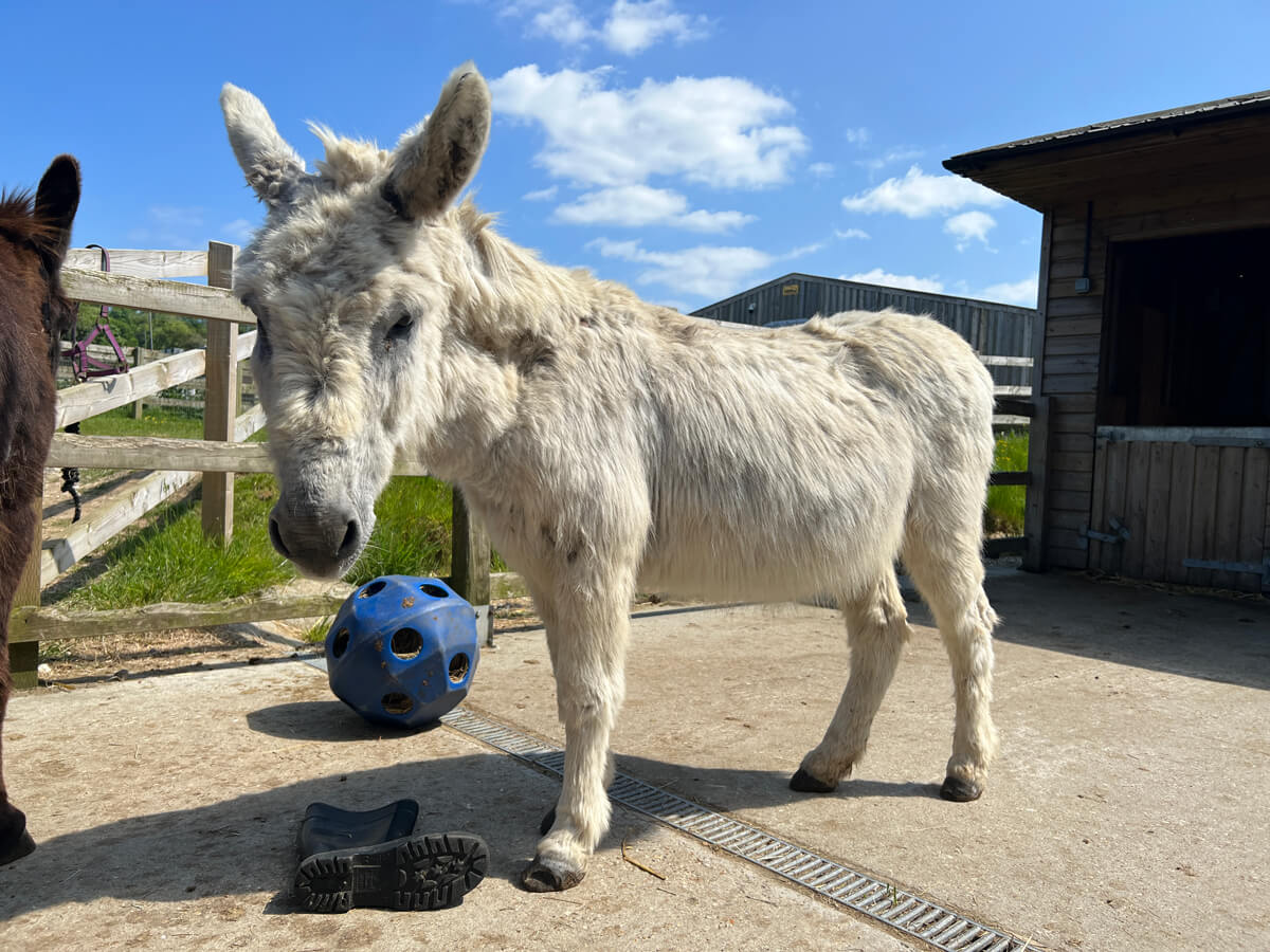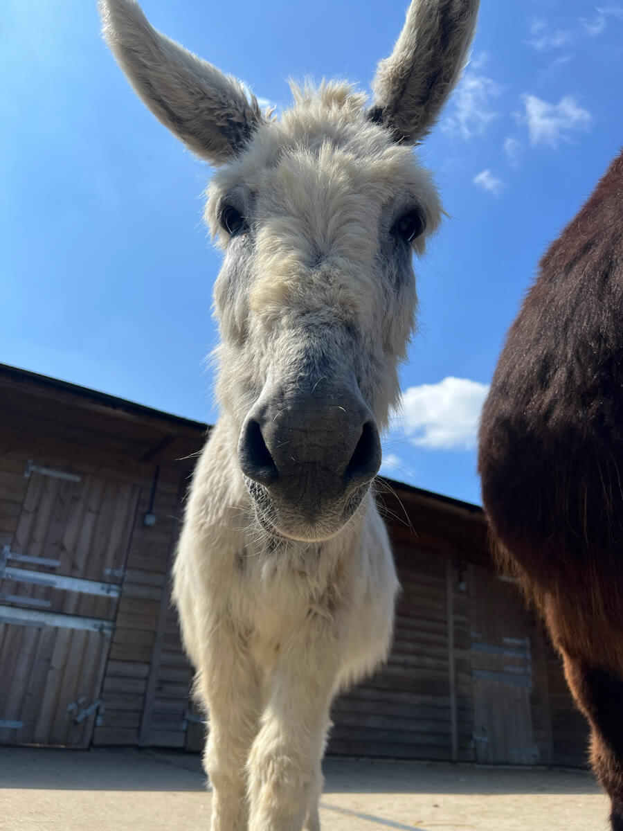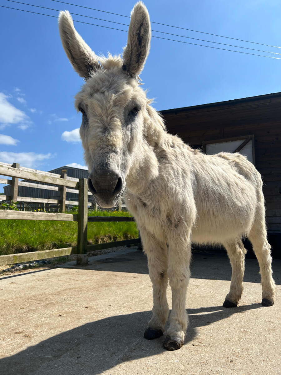 Donkeyote arrived at the Sanctuary in May 2023. He was a pet for many years, until his owner made the decision to re-home him due to ill health. He came to us from the New Forest and is a calm, sweet donkey.