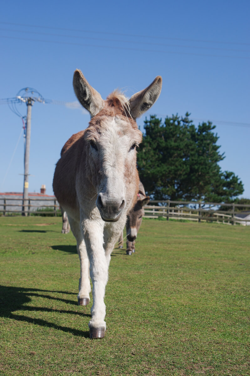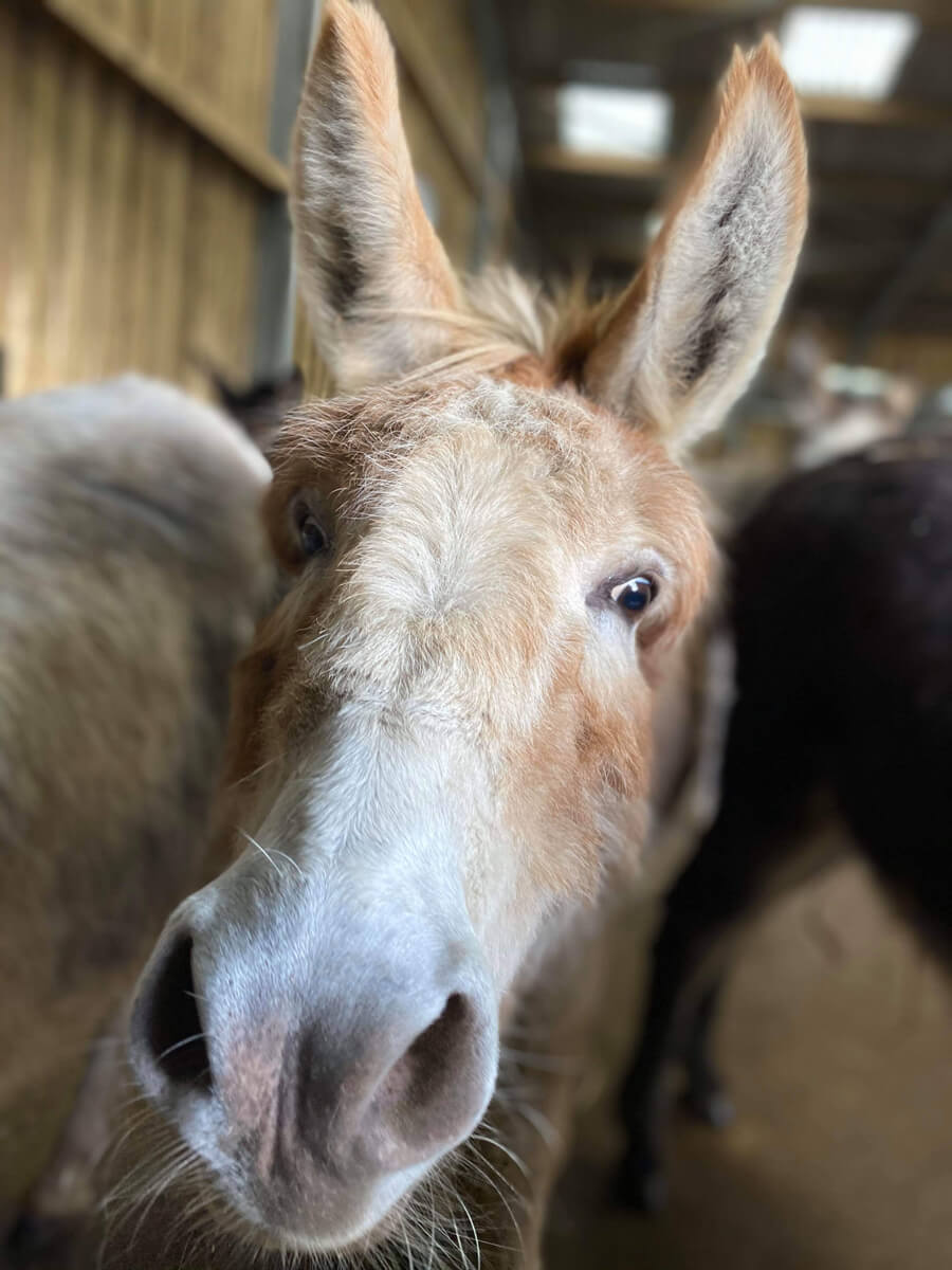 Paddy O is a distinctive red roan colour who stands out from the crowd! His colouring is very unique and rare for a donkey. He came to us from Wales, but we believe he was from Ireland originally. He's very curious and often searches our team's pockets for food!