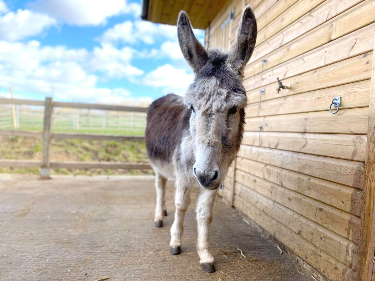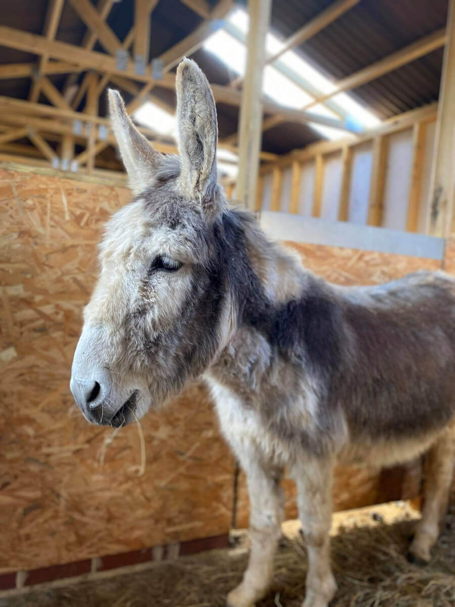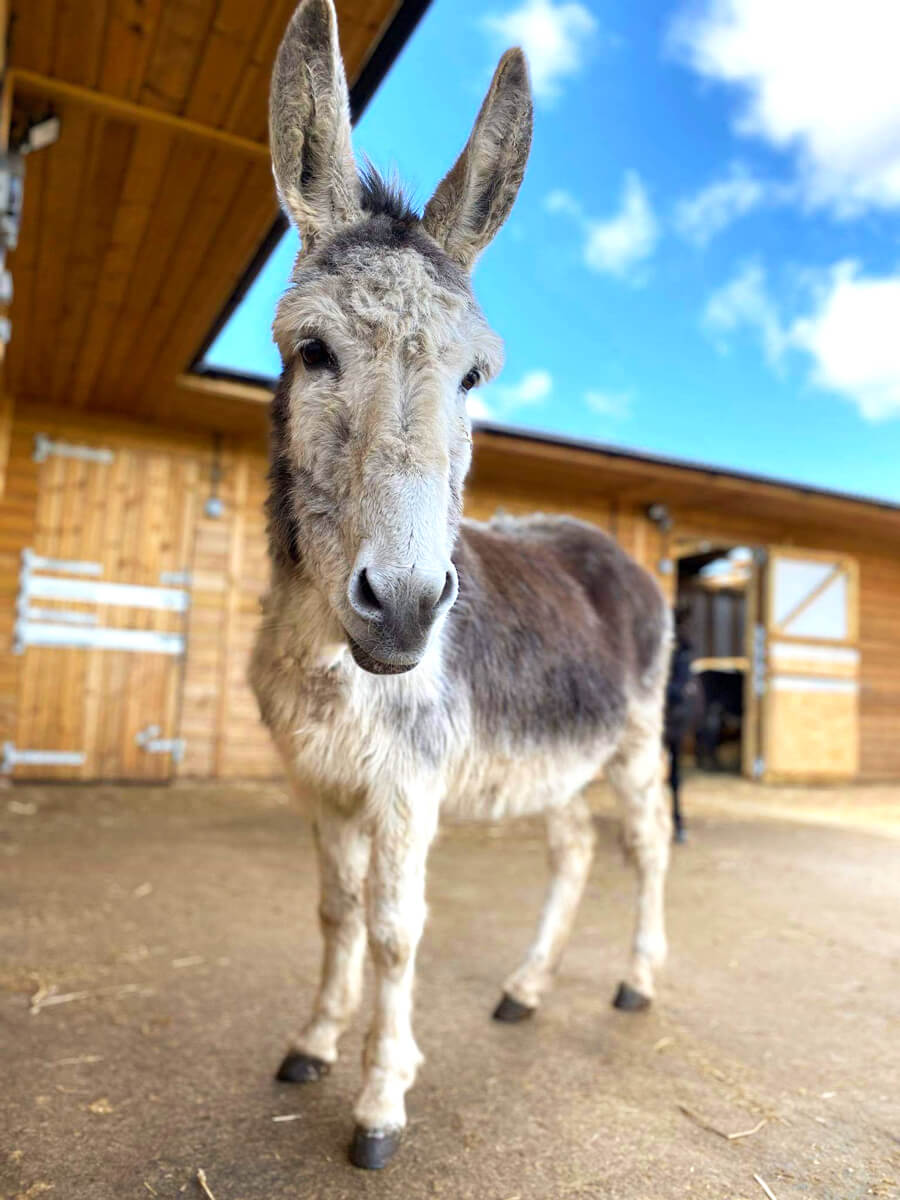 Smudgie is a grey and white donkey who came to the sanctuary in 2017 from Wales. She arrived with her foal Leighton. Smudgie is bright, intuitive and has been on many community visits during her life at the sanctuary. She's very confident donkey with a distinctive bray that sounds a bit like a scream!
